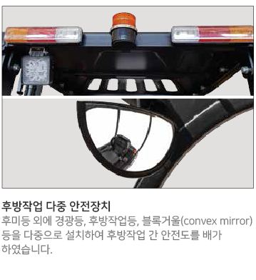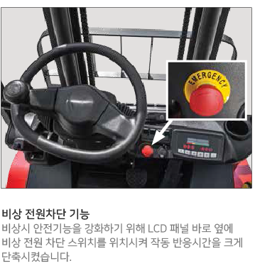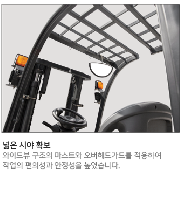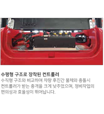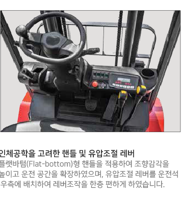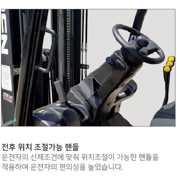 조작이 편리한 핸들 및 유압조절 레버, 수평형 구조로 장착된 컨트롤러 등의 장착, 그리고 볼트 체결방식의 배터리 단자를 적용하는 등 최상의 편의성과 정비성을 구현하였습니다.