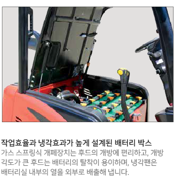 전후 위치 조절이 가능한 핸들, 탈착작업과 냉각효과가 높게 설계된 배터리실,